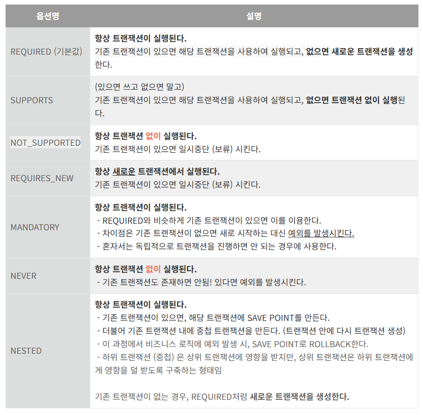 • 특정 트랜잭션 동작 도중 또다른 트랜잭션을 호출(실행) 하는 상황에서 트랜잭션을 어떻게 동작시킬 것인지 결정하는 방식 (ex. 트랜잭션이 적용된 메서드에서 트랜잭션이 적용된 또다른 메서드를 호출하는 상황)