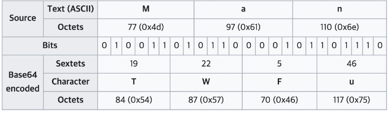 ** 여기서 64란, 0~9까지의 숫자(10), 알파벳 대문자(26), 소문자(26), 임의의 문자 2개(+, /) 로 encoding한다는 의미이다. (10 + 26 + 26 + 2) **