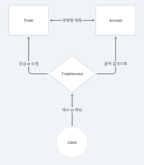 Account는 고객의 주식계좌의 역할을 맡은 객체이며, Trade 객체는 거래를 진행함에 있어 어떤 주식을 몇 개 팔 것인지, 거래 종류는 매도인지 매수인지를 나타내는 객체이다.