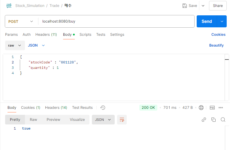 원하는 주식의 코드와 갯수를 정해주면, 매수가 가능하다.